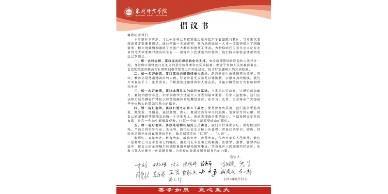 第30个教师节前夕,习近平总书记到北京师范大学考察,与师生代表座谈并发表重要讲话,在我校师生中引起热烈反响。9月25日,来自各二级学院的15名教师代表联名向全校全体教师发起《响应习近平总书记号召做党和人民满意的好老师》的倡议。