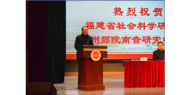 冯潮华代表福建省社科联组织对南音基地揭牌表示衷心的祝贺,他在贺辞中指出,近些年泉州师院在南音方面的人才培养,学术研究和对南音传统文化的挖掘、弘扬和保护做了大量的工作,此次研究基地的揭牌,展示了泉州师院在南音研究方面的优势和力量。希望南音研究中心以基地成立作为新的起点和契机,进一步规划研究中心未来学术研究的方向,凝练学术研究的主题,充分发挥研究基地在整合南音研究资源的作用。做好南音宣传、推广和推介工作。同时还要加强南音人才的培养和队伍的建设工作。
