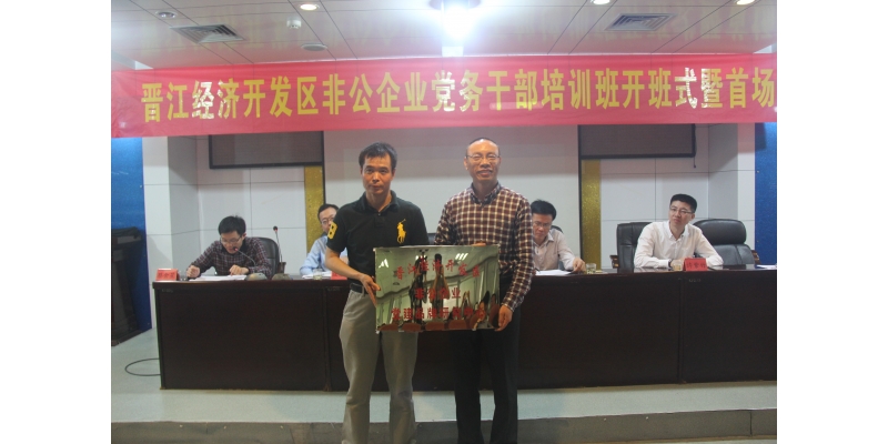 5月23日上午,晋江经济开发区非公企业党务干部培训班暨校地合作签约授牌仪式在开发区科技综合大楼举行。泉州市委组织部部务会议成员、市委非公企业工委专职副书记江振平,晋江市委办副主任许紫竹,晋江市委组织部副部长、非公有制企业党工委书记庄东航,晋江经济开发区党工委书记谢永彬,我校陈守仁工商信息学院党委书记颜水发,晋江经济开发区各非公企业党组织班子成员、党员业务骨干参加了仪式。