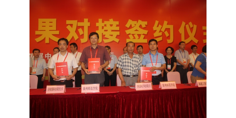 在高校成果展示专区,郑瑞生副教授研发的“温和加工即食鲍鱼产品栅栏因子设置及生物保鲜技术”、潘玉灼高级实验师研发的“小功率金卤灯”、吴志伟讲师研发的“基于安卓手机的汽车胎压监测装置”等优秀成果在高校成果展区进行实物展示。在教育部科技发展中心、福建省教育厅主办的“高校科技项目成果对接签约仪式”上,化学与生命科学学院与泉州索爱膜科技开发有限公司、数学与计算机科学学院与福建贝特迈斯电子科技有限公司进行了项目成果对接签约仪式。