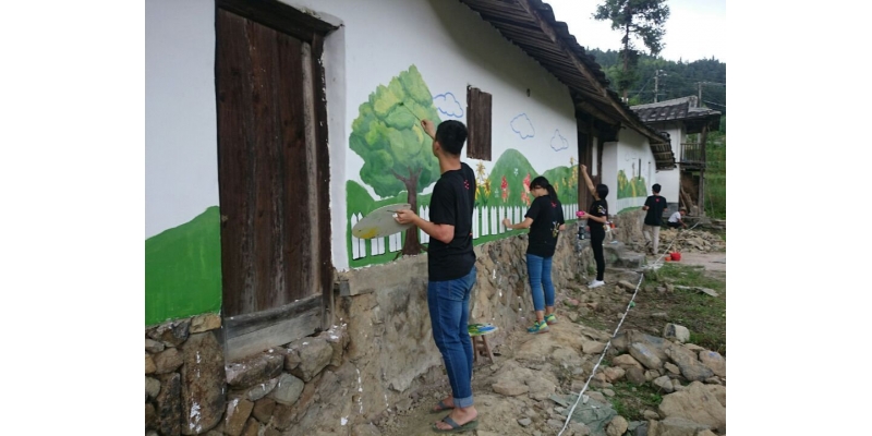 作为我校结对帮扶村的联星村,是第四轮省级贫困村,文化设施相对落后,文化氛围不浓。为改善这种情况,美术与设计学院充分发挥高校服务社会功能,从学院中选拔16名专业技能优秀的学生组建了暑期社会实践小分队,并由专业教师带队指导,走进联星村。师生一行首先走访乡村,同时结合整个乡村的特色,设计以社会主义核心价值观、敬老爱老传统美德以及美丽乡村为主要内容的彩绘文化墙。随后便开始进行文化墙的彩绘工作。由于正值夏季,乡村蚊虫多,太阳大,但是学生们依然坚持创作。他们分工协作,共同克服难题,最终有条不紊圆满完成任务。