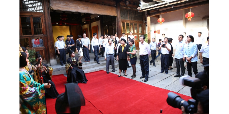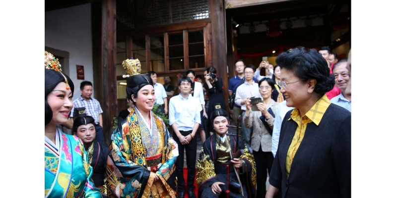 在博览苑内,刘延东副总理欣赏了南音新作《凤求凰》。期间王珊副校长向刘延东副总理介绍了南音的价值和地位,汇报了泉州师范学院主动服务国家文化传承、发展创新所做出的努力与成效,提到在我国高校以非物质文化遗产代表作项目来作为专业办学的,唯有泉州师范学院,《凤求凰》的创作与展演是南音文化传承与发展协同创新中心的重要工作之一。