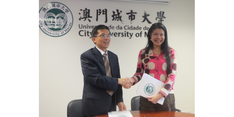 在澳门城市大学,李清彪校长和梁文慧副校长代表双方签署姐妹校协议。