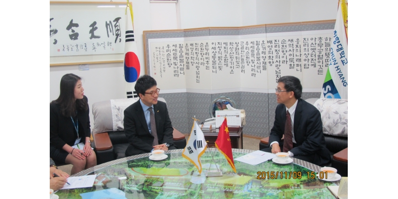 李清彪校长一行与顺天乡大学校长徐教一和副校长金学民进行交流座谈。双方探讨拓展合作项目,包括继续扩大交流生规模,拓展3+1或2+2模式联合培养人才,选派优秀生攻读硕士,合作开展语言培训,探讨联合办学项目等。