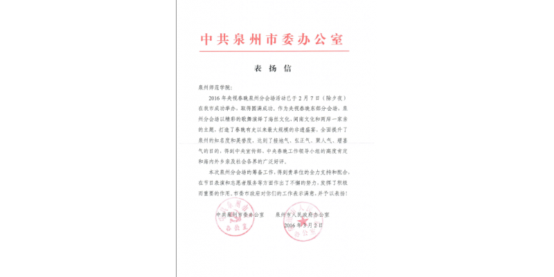 表扬信中指出,在今年央视春晚泉州分会场的筹备工作中,我校给予了全力支持和配合,在节目表演和志愿服务等方面作出了不懈努力,发挥了积极而重要的作用。