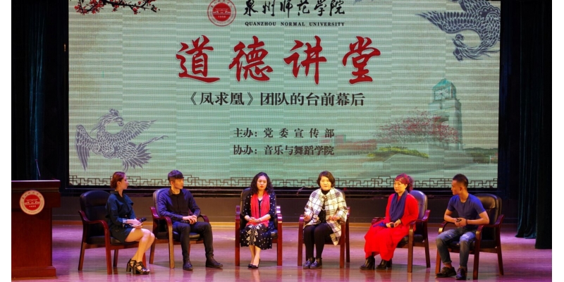 4月14日,由校党委宣传部主办、音乐与舞蹈学院协办的“泉州师范学院道德讲堂活动----《凤求凰》团队台前幕后的故事”在音乐厅举行。校党委书记游小波、副书记高云程、副院长王珊、纪委书记邱银富,各二级学院师生代表近300人参加了活动。