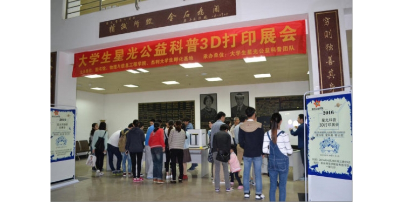 2016年4月20日,由物理与信息工程学院、图书馆、杰利大学生孵化基地联合主办,物理与信息工程学院大学生星光公益科普团队承办的“大学生星光公益科普3D打印展会”在学校图书馆一楼大厅举办。李清彪校长到现场观摩指导。