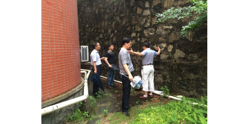 检查组成员冒着大雨分别来到理工实验楼群、学生公寓A、B区所有楼栋、校园道路、俊秀大楼及周边围墙、在建工地进行现场查看。陈副校长与检查组成员深入到每栋建筑物及周边环境,重点查看了栋楼周边的山体和挡土墙状况.