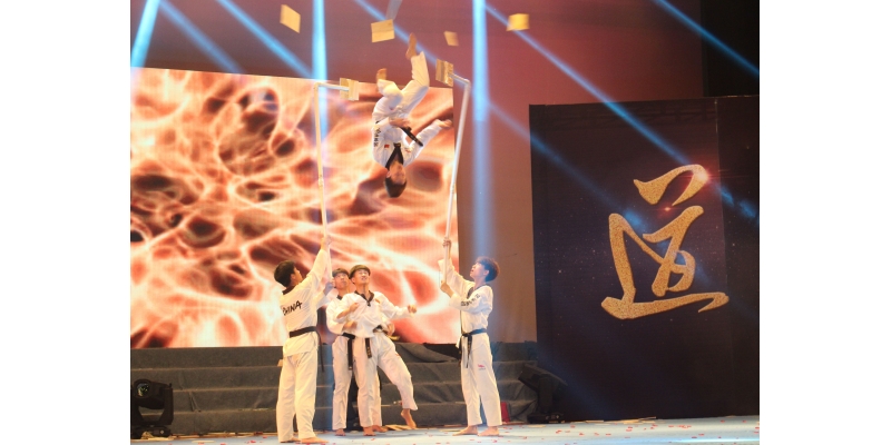 伴随着激情四射的背景音乐,示范团成员们为我们带来了礼仪操、腾空前踢特技、一秒内滞空连踢三脚、空中转三圈后踢腿等多种跆拳道专项表演,他们精湛的跆拳道品势技术、干净利落的跆拳道动作、高超的跆拳道特技表演,赢得了全场观众一次又一次的掌声和欢呼。队员们将跆拳道“以礼始、以礼终”的礼仪文化展现得淋漓尽致,同时也传递了“礼仪、廉耻、忍耐、克己、百折不屈”的跆拳道精神。