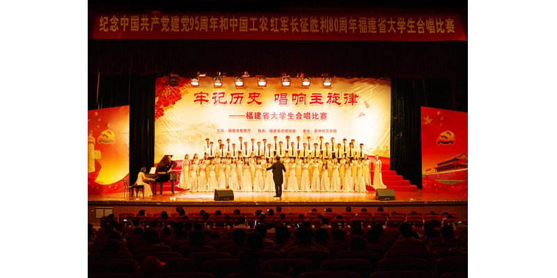 6月4日,由省教育厅主办、省合唱协会协办、我校承办的纪念中国共产党建党95周年和中国工农红军长征胜利80周年福建省大学生合唱节目巡评赛在我校陈祖昌大礼堂举行。我校陈亚兵副校长、省教育厅体卫艺和文字工作处叶灵处长到场观看比赛。比赛由中国合唱协会副理事长、福建省合唱协会会长、国家一级指挥邱孝胥,中国合唱协会常务理事、福建省合唱协会副会长、省幼高专教授邵宁等9名相关专业人士担任评委。