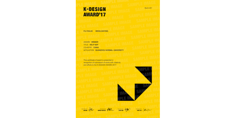 5月23日,2017年韩国K-DESIGN国际设计奖评奖结果公布,我校美术与设计学院教师傅游磊及其研发团队设计的作品《HELP NAP》获“Winner Award ”奖项,颁奖典礼将于2017年8月26日在韩国首尔举行。