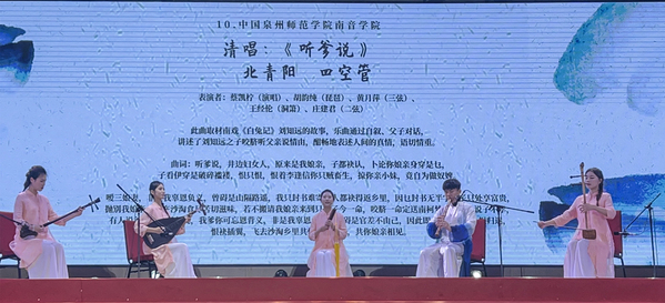 第四届世界南音联谊会南音大汇演以“南得一见,音您而来”为主题,我校师生清唱了南音《听爹说》,与海内外南音弦友共同演绎了《行到凉亭》《三叠尾声》《风打梨》等南音曲目,师生精湛的表演展现了南音艺术的独特魅力,赢得了与会嘉宾的广泛赞誉。
