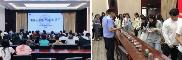 会上,保卫部负责人与戒毒所兰翠河签署合作共建协议,陈秋燕与林炎平共同揭牌“大学生禁毒教育基地”,并为警官、辅导员和学生代表颁发法制安全宣传员聘书。福建省泉州司法强制隔离戒毒所警官吴金镖为与会师生作题为《警惕女巫的“毒苹果”》的警示宣讲,师生现场观摩各类仿真毒品和翻阅宣传品。