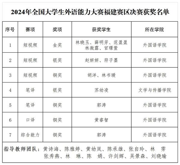 日前,2024“外研社·国才杯”“理解当代中国”全国大学生外语能力大赛福建赛区决赛圆满落幕。本次比赛由福建省教育厅主办,福建师范大学、福建医科大学、华侨大学承办,以“理解中国,沟通世界”为主题,共设综合能力、笔译、演讲、口译以及短视频等赛项。经过激烈角逐,我校学子斩获金奖1项、银奖2项、铜奖4项。