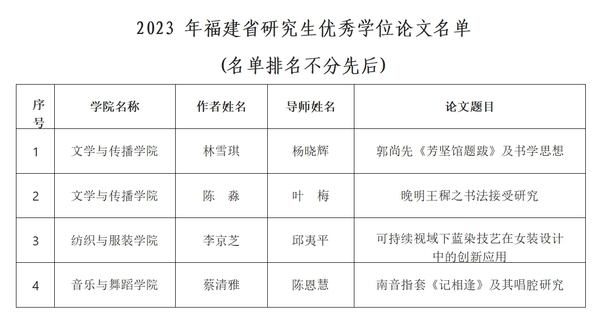 近日,福建省学位委员会办公室公布“2023 年福建省研究生优秀学位论文”评选结果,我校选送的4 篇学位论文全部入选。这是对我校研究生的培养质量的充分肯定。