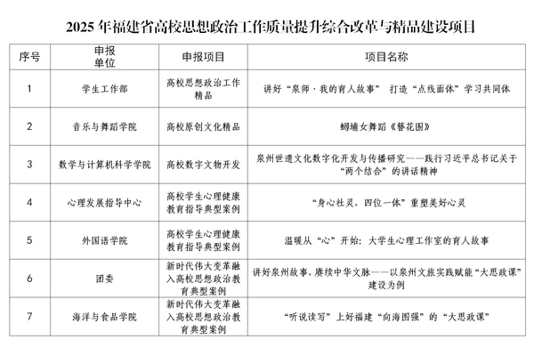 近日,中共福建省委教育工委公布2025年福建省高校思想政治工作质量提升综合改革与精品建设项目入选名单,我校共有7个项目入选。