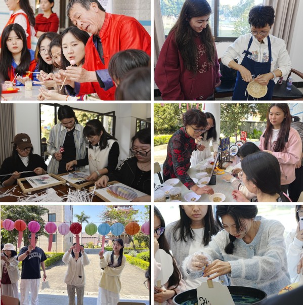 活动现场气氛热烈,非遗技艺的魅力令人目不暇接。妆糕人传承人张明铁老师以巧手捏制出栩栩如生的彩色人偶,引得师生连连赞叹;糖画传承人陈学珍老师以糖浆为墨,在案板上勾勒出花鸟鱼虫等灵动图案,甜香四溢;漆扇传承人刘璟耀老师以水为媒,通过波纹将漆料晕染出独特纹理,形成一件件绚丽的艺术品;珠绣传承人陈克忍老师以针线串起五彩珠片,在布面上绣出闽南传统纹样,精致华美;永春纸织画传承人张巧云老师以细密经纬编织宣纸,创作出立体生动的山水画卷;安溪竹藤编传承人陈红萍老师则现场展示竹藤编织技艺,将柔韧的竹条与藤蔓巧妙结合,制成提篮、杯垫等兼具实用与美感的作品。现场师生在各位传承人的指导下,沉浸式体验了闽南传统技艺的独特魅力。闽南文化猜灯谜专区更是人气高涨,师生们驻足竞猜,在趣味互动中深入感受闽南语言与习俗的独特韵味。