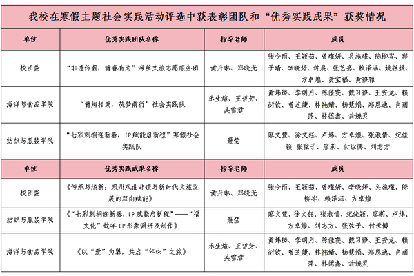 3月25日,中共福建省委教育工委公布了“追寻领袖足迹 体悟优秀传统文化”2024—2025学年全省大学生寒假社会实践活动评选结果。我校获评“优秀组织单位”,“非遗传薪,青春有为”海丝文旅志愿服务团等三支社会实践队获评“优秀实践团队”,《传承与焕新:泉州戏曲非遗与新时代文旅发展的双向赋能》等三个作品获评“优秀实践成果”,物理与信息工程学院教师黄祖榜、化工与材料学院教师朱旋旋、数学与计算机科学学院学生郭文晴等三位师生获评“优秀实践个人”。