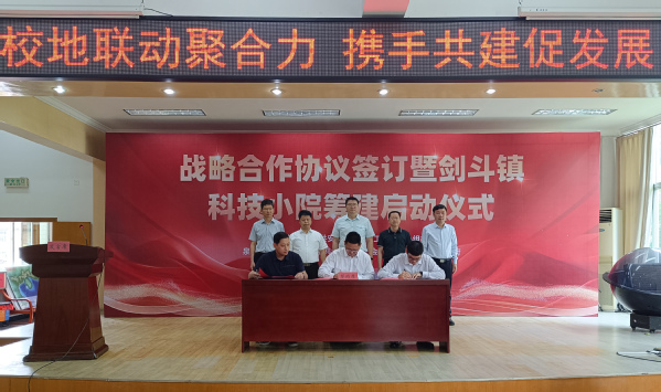 在各方领导的见证下,三方代表签订战略合作协议,将围绕乡村振兴产业发展、人才培养、科技服务等领域展开深度合作。活动现场还举行资源与环境科学学院与剑斗镇产学研基地揭牌仪式、大学生实践基地揭牌仪式。