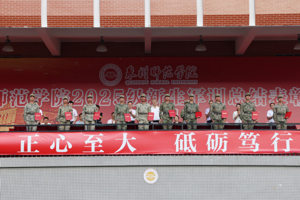 会上,教务处负责人宣读了此次军训评选出的先进集体和个人名单;外国语学院2025级英语(师范)类专业黄晶同学代表军训标兵发言。
