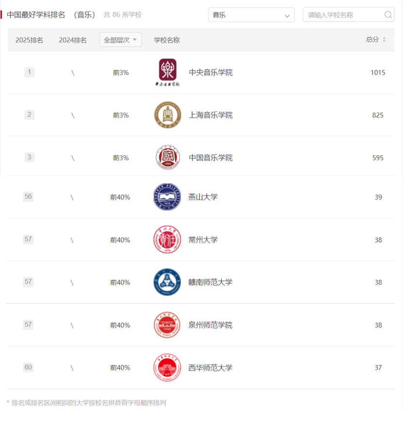 近日,高等教育评价专业机构软科正式发布2025软科中国最好学科排名”。我校“音乐”学科在所有参评学校中排名层次进入前40%,位居57