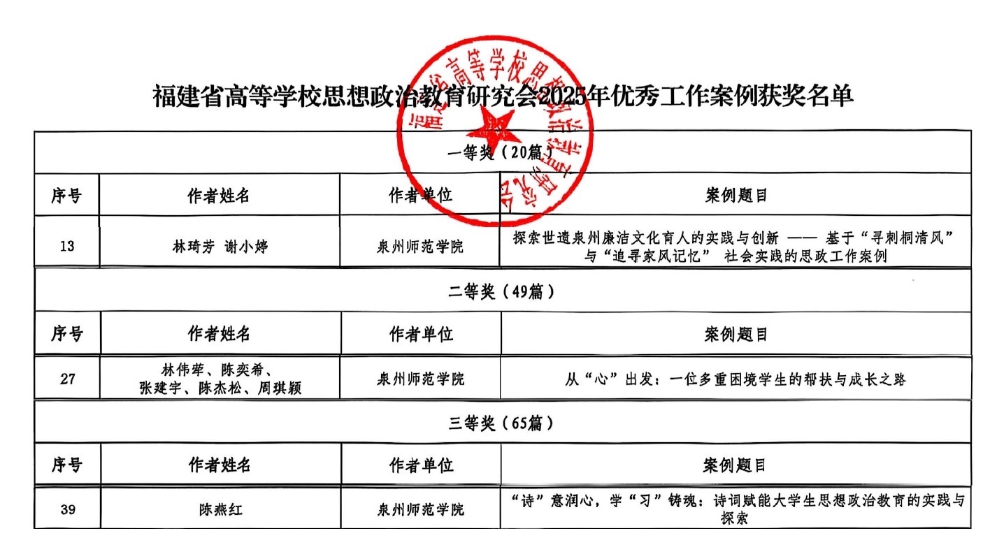 近日,福建省高等学校思想政治教育研究会公布了2025年优秀工作案例获奖名单,我校共有3个案例入选。