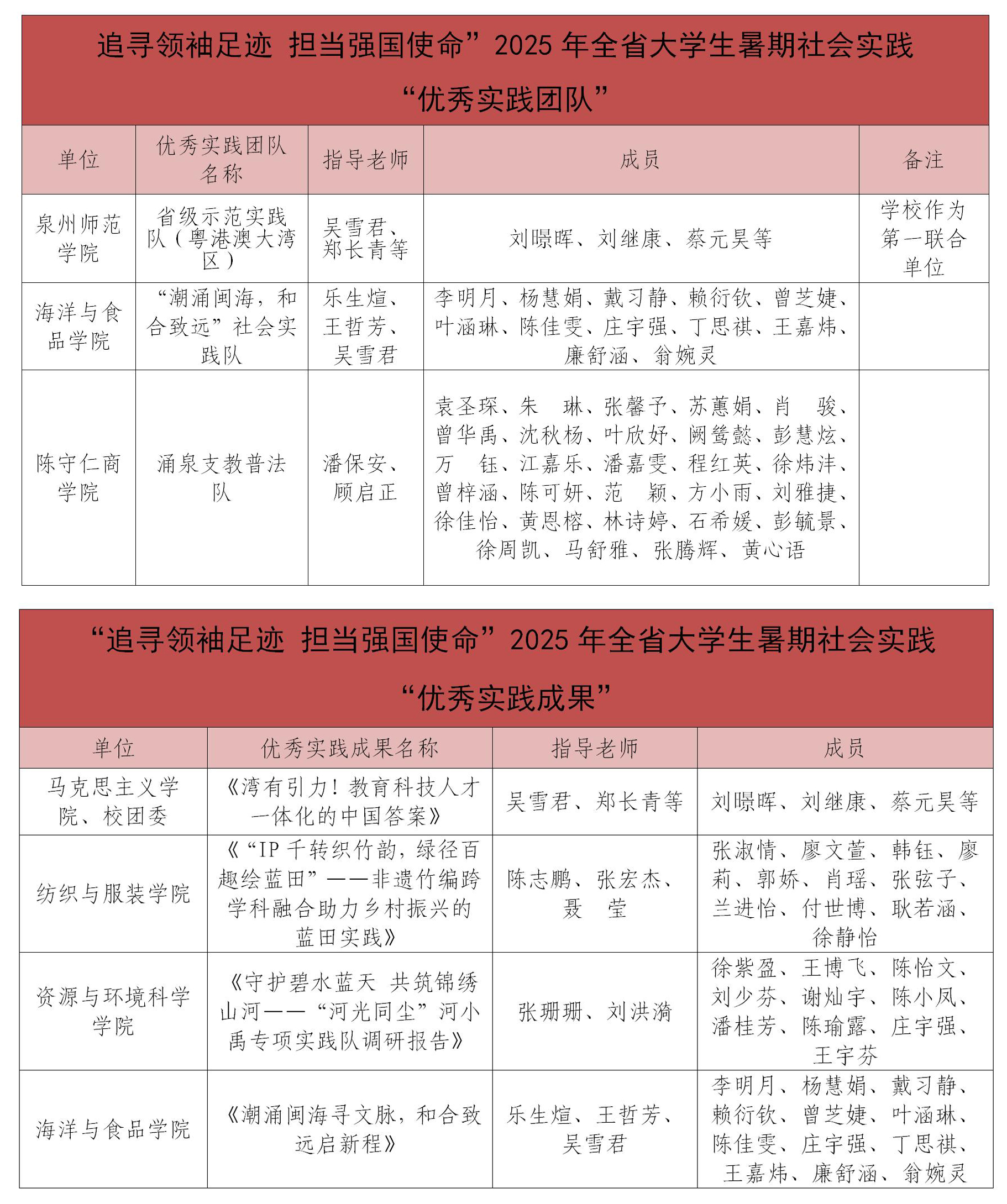 日前,中共福建省委教育工委公布“追寻领袖足迹 担当强国使命”2025年全省大学生暑期社会实践活动评选结果。学校获评“优秀组织单位”。“潮涌闽海,和合致远”社会实践队等3支实践队获评“优秀实践团队”;《“IP千转织竹韵,绿径百趣绘蓝田”——非遗竹编跨学科融合助力乡村振兴的蓝田实践》等4项成果获评“优秀实践成果”;马克思主义学院吴雪君老师、物理与信息工程学院薛君梅老师、化工与材料学院程如心同学等3位师生获评“优秀实践个人”。
