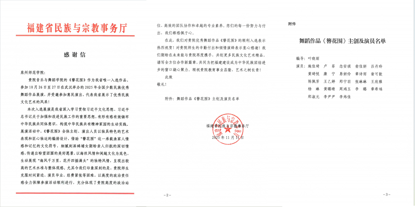 11月11日,福建省民族与宗教事务厅向我校发来感谢信,对我校优秀舞蹈作品《簪花围》顺利入选2025年全国少数民族优秀舞蹈作品展演给予高度肯定,对我校师生的辛勤付出和倾情演绎表示衷心感谢。