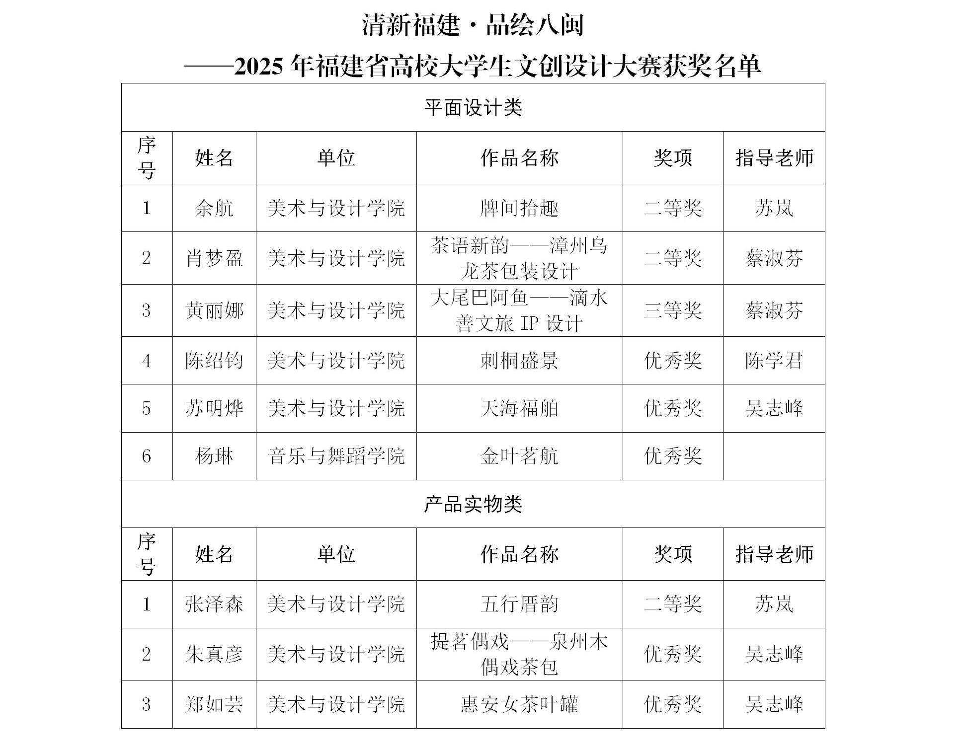 近日,清新福建·品绘八闽——2025年福建省高校大学生文创设计大赛圆满结束,我校学子积极参与,共有21件作品参赛。经过激烈角逐,获平面设计类二等奖2项、三等奖1项、优秀奖3项;产品实物类二等奖1项、优秀奖2项。美术与设计学院苏岚、蔡淑芬老师获“优秀指导教师奖”,图书馆获“优秀组织奖”。