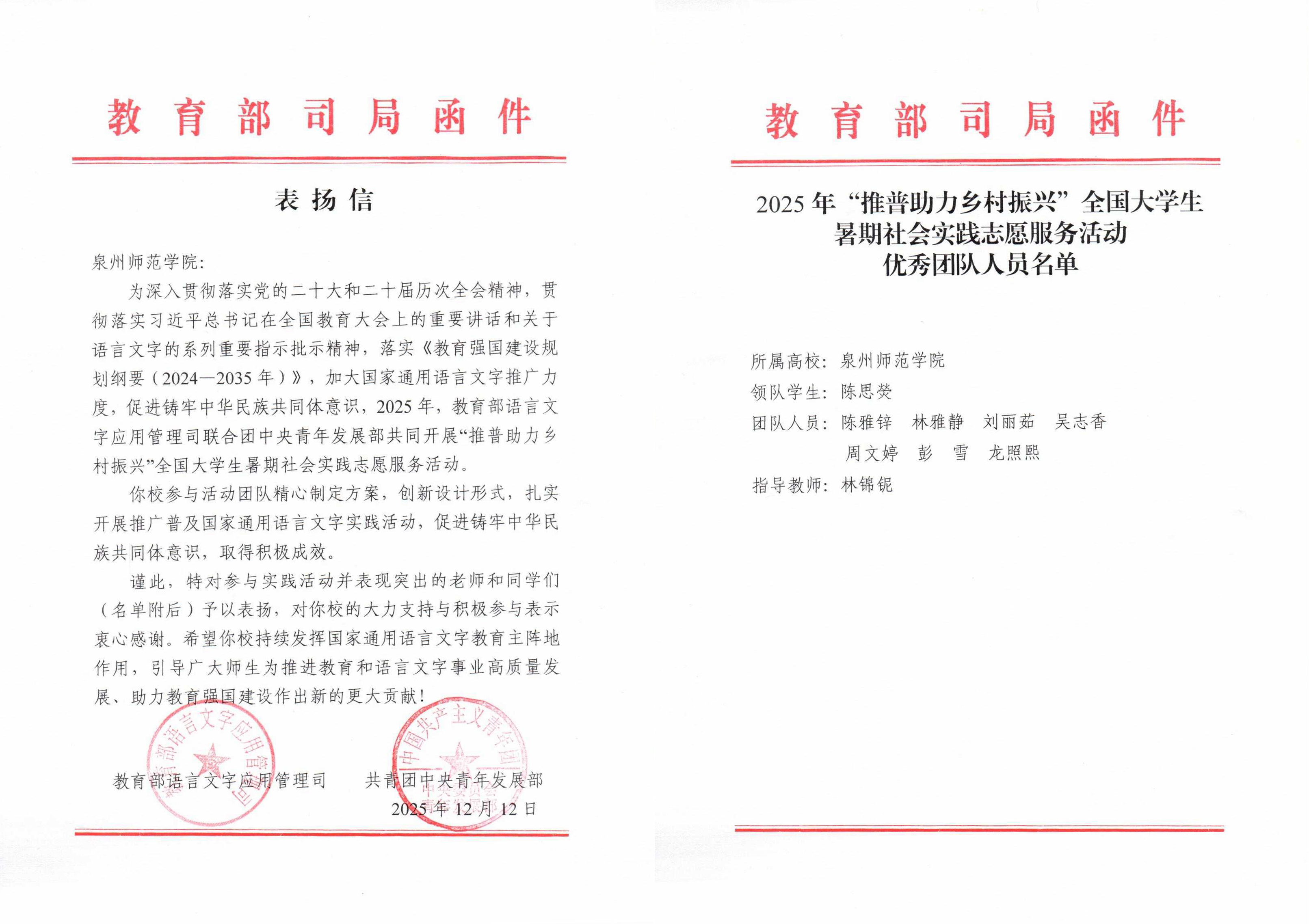 近日,我校收到教育部语言文字应用管理司、共青团中央青年发展部发来的表扬信。我校志愿服务团队(成员:陈思熒、陈雅锌、林雅静、刘丽茹、吴志香、周文婷、彭雪、龙照熙,指导老师:林锦铌)在2025年“推普助力乡村振兴”全国大学生暑期社会实践志愿服务活动中表现突出受到表扬,并获评“优秀团队”。