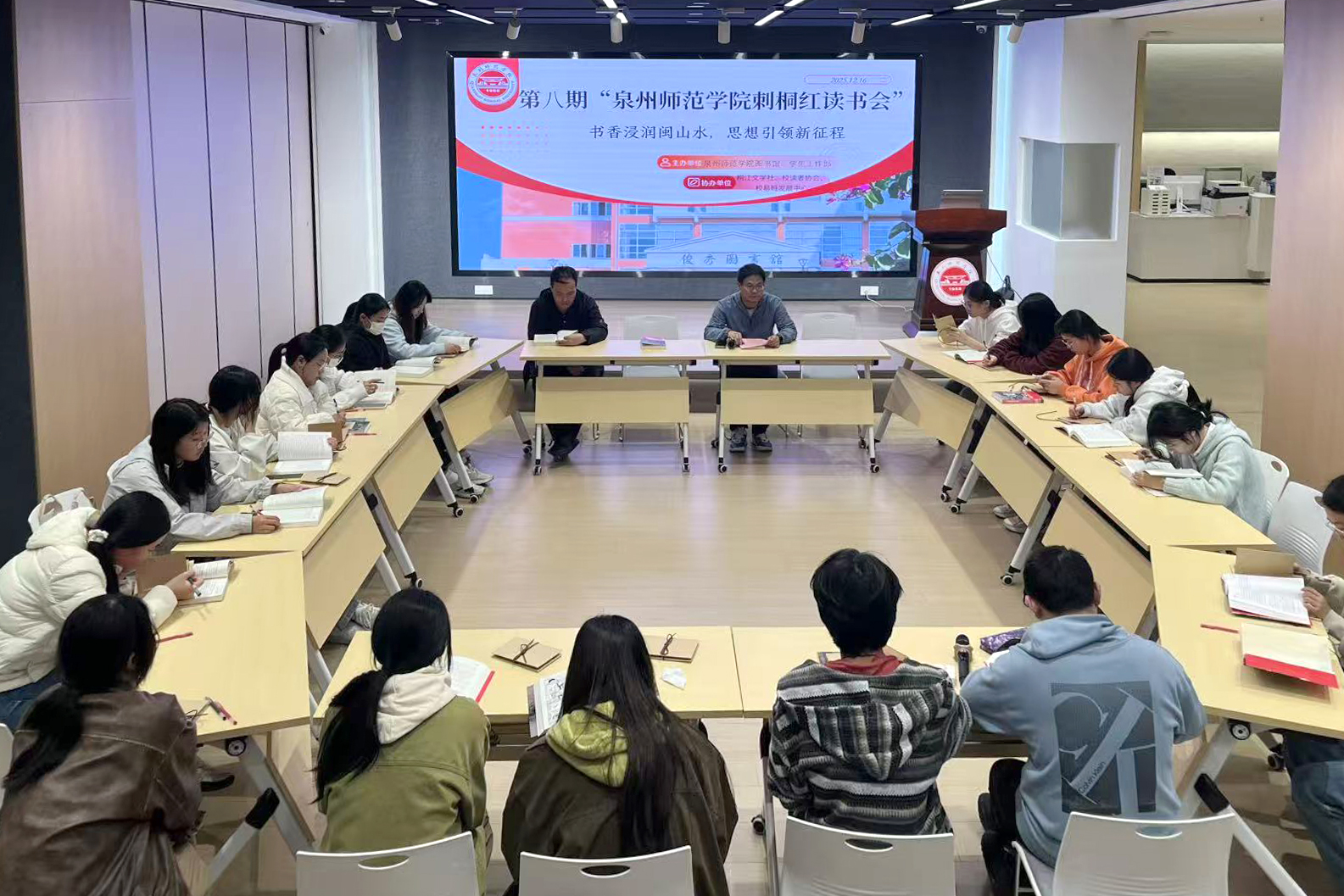 近日图书馆联合读者协会在图书馆三楼红色悦读空间举行第八期“刺桐红读书会”。读书会以“书香浸润闽山水,思想引领新征程”为主题,吸引了广大学生参与,在书香与思想交流的碰撞下深化理论认识、凝聚奋进力量。