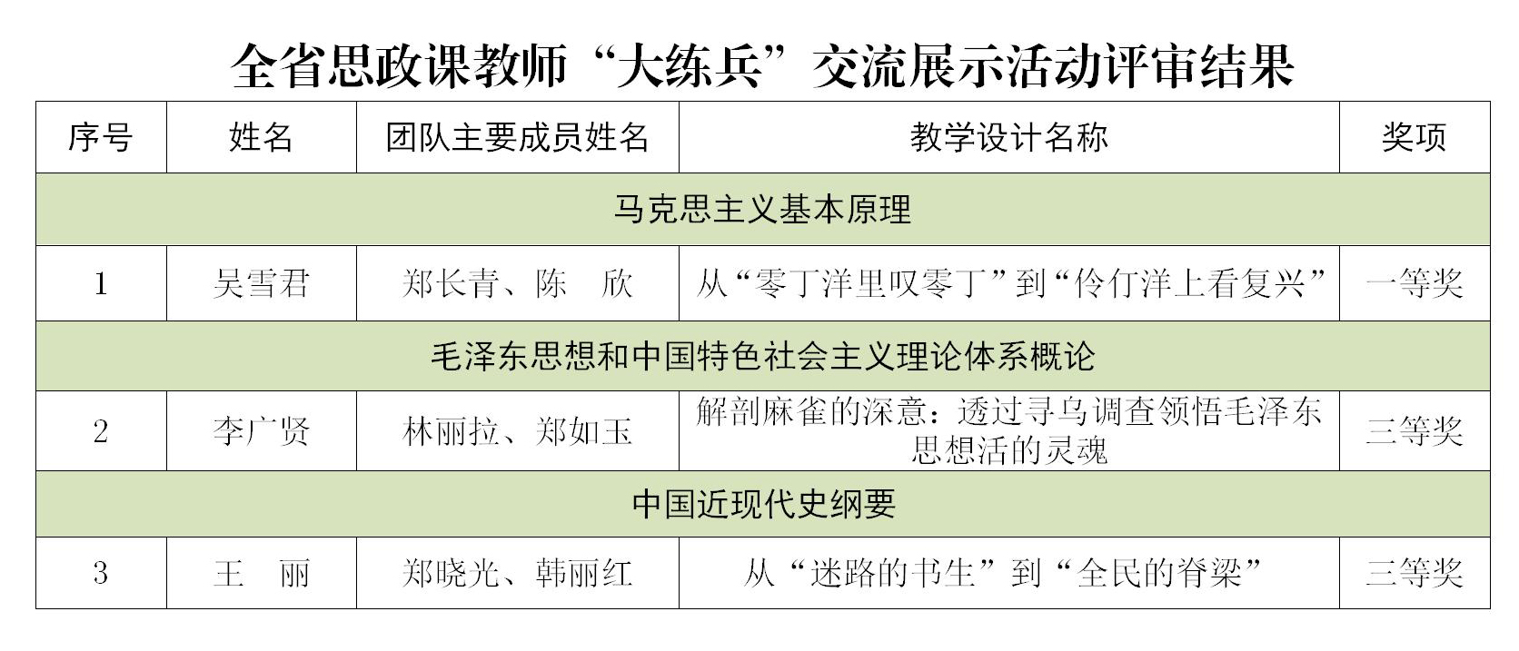 日前,全省思政课教师“大练兵”交流展示活动结果揭晓,我校马克思主义学院教师吴雪君获本科组一等奖,王丽、李广贤获得本科组三等奖。