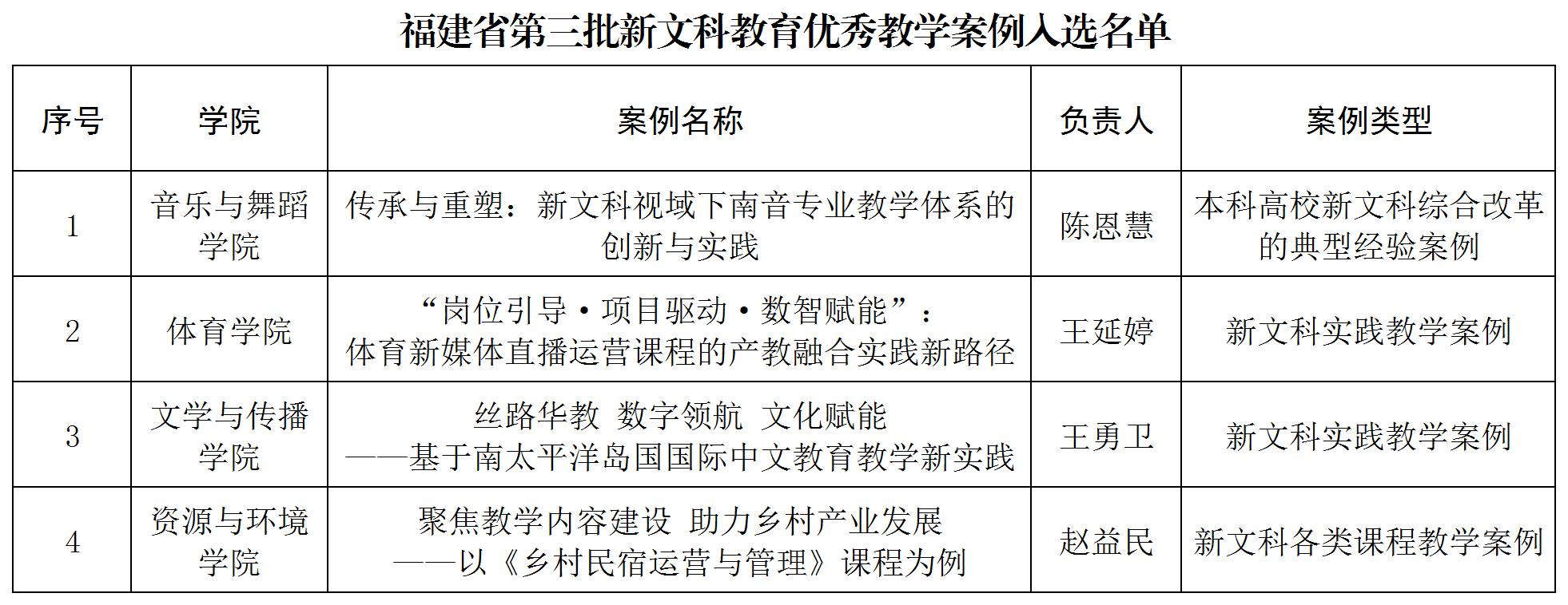 近日,福建省新文科教育研究中心公布了第三批新文科教育优秀教学案例征集入选名单,我校共有4个教学案例成功入选。至此,我校累计入选福建省新文科教育优秀教学案例9个,这一成绩是我校持续推动新文科建设,创新实践所取得的又一成果。