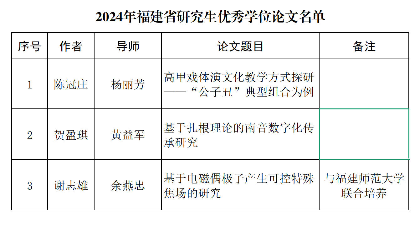 近日,2024年福建省优秀研究生学位论文评选结果公布,我校陈冠庄同学《高甲戏体演文化教学方式探研——以“公子丑”典型组合为例》、贺盈琪同学《基于扎根理论的南音数字化传承研究》2篇硕士学位论文获评省级优秀硕士学位论文。获评论文为我校独立培养成果,均聚焦泉州非遗文化传承创新,为地方传统文艺保护与发展提供了新思路。