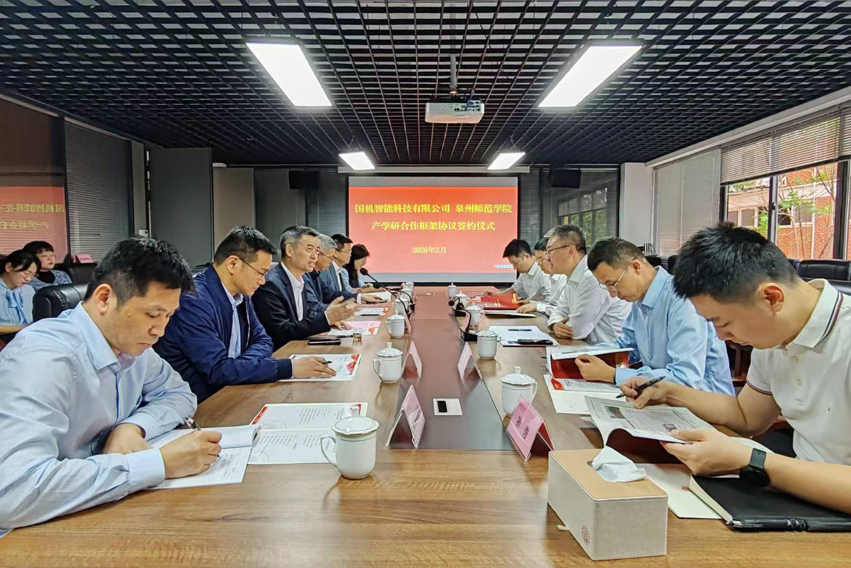 王宝成代表国机智能科技有限公司向学校的热情接待表示感谢。他介绍了国机智能科技有限公司的前身溯源、业务范围、科研平台及发展愿景。他表示,泉州师范学院办学底蕴深厚、学科实力强劲,为国家培养了大批优秀人才。期待双方紧扣人才共育、科研共研、成果共享核心方向,深化全方位务实合作,打造“产学研用”融合发展的示范样板,共同开拓校企合作的新赛道、新模式。